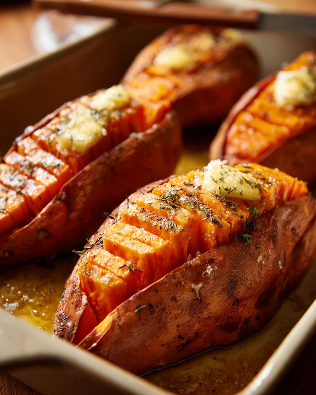 For a slightly less sweet version, cut the brown sugar down to 1/4 cup and add a pinch of salt to the butter mixture to bring out more of the natural sweetness of the potatoes. If you like a little crunch, sprinkle chopped pecans over the scored tops before baking uncovered for the final 20–30 minutes. For a more dessert-leaning side, add a splash of vanilla extract to the butter mixture and finish with a light drizzle of maple syrup right before serving. You can also swap the cinnamon for pumpkin pie spice or a mix of cinnamon and nutmeg for a deeper, holiday flavor. If you’re short on time after work, score the sweet potatoes the night before and store them in the fridge; when you’re ready to cook, just mix the glaze, pour it over, and bake. Leftovers reheat well in the microwave or toaster oven—add a tiny pat of butter on top to refresh them and they taste like they just came out of the oven.