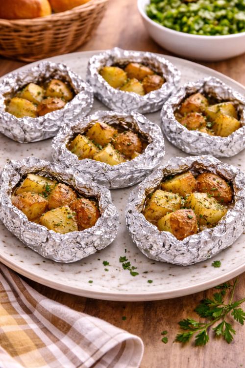 Form the foil packets: Tear off rectangles of heavy-duty foil, roughly 12 x 12 inches. Spoon a portion of the potatoes (about 1/4 of the total) into the center of each piece of foil, making sure some butter pieces land on top. Bring the sides of the foil up and together, then fold and crimp to seal, creating a tight packet. Fold in the ends as well so no steam escapes.