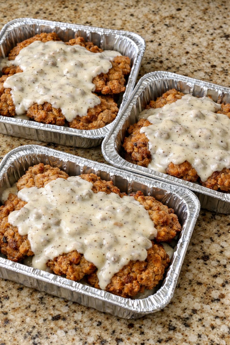 Rest and assemble. Turn off the heat and let the gravy sit a minute to settle. Arrange the chicken fried steaks in their foil trays or on a serving platter. Spoon some of the hot gravy over the top, leaving extra in a bowl or gravy boat on the side. If you like, sprinkle with chopped fresh parsley for a little color against the golden crust and creamy gravy.