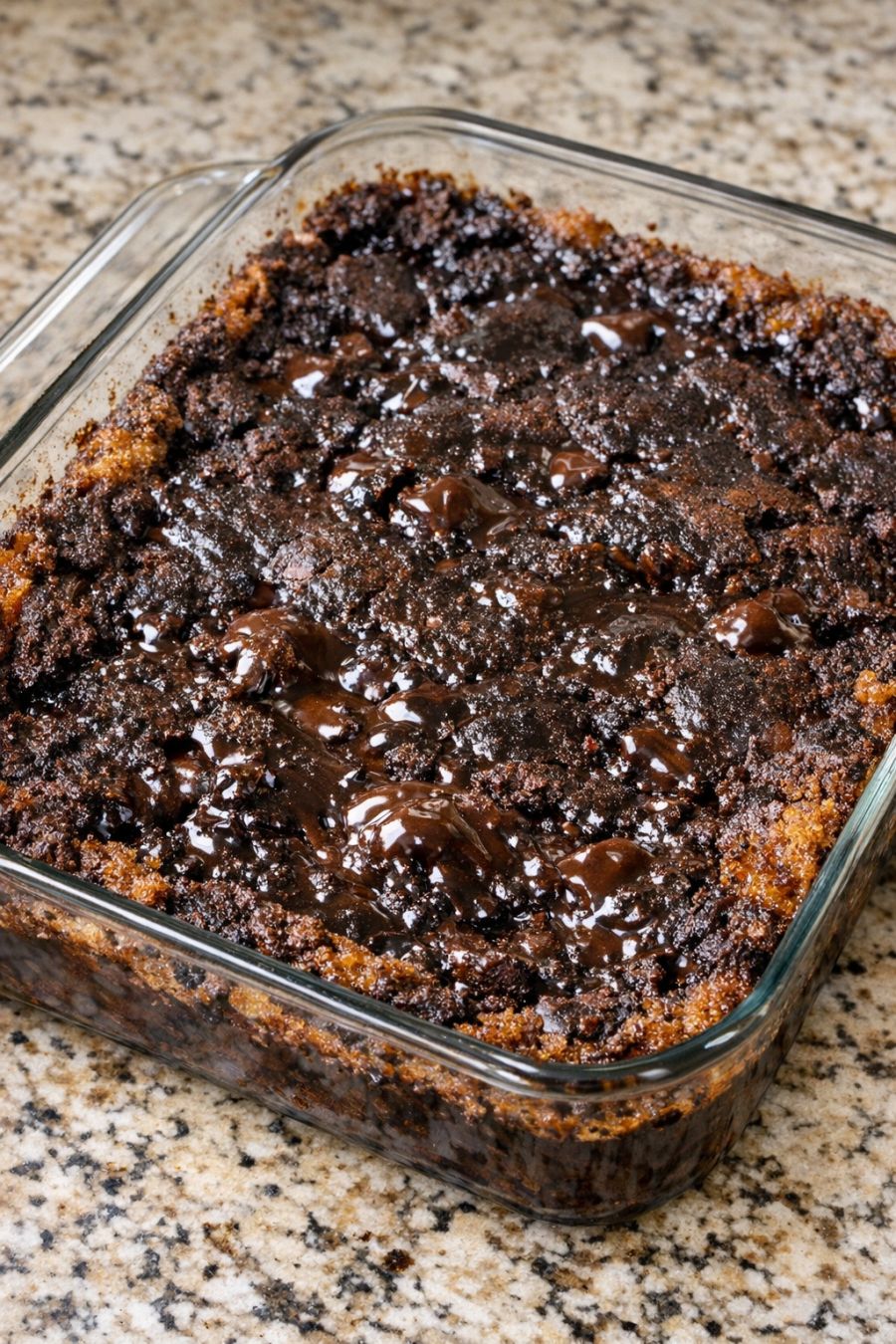 Place the baking dish on the center oven rack and bake for 25–30 minutes, or until the top looks set and slightly crackly, with bubbly, gooey chocolate peeking through in places. The edges should be crisp and deeply browned, while the middle stays soft and fudgy.