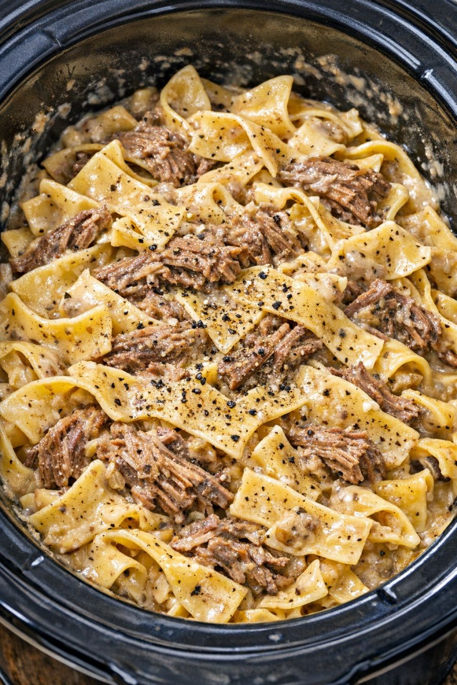For a richer flavor, use leftover pot roast or chuck roast that’s been cooked in the slow cooker or oven; this adds that classic Amish-style depth without extra work. You can swap cream of mushroom soup for cream of beef or cream of celery if that’s what you have on hand. If you prefer a looser, more brothy dish, add an extra 1/2 to 1 cup of beef broth and check the noodles a bit earlier. For extra veggies, stir in 1 to 2 cups of frozen peas and carrots or mixed vegetables during the last 30 minutes of cooking so they warm through without turning mushy. To make it feel a little lighter, use light sour cream and low-sodium broth and soup. If you like a touch of freshness, sprinkle chopped fresh parsley on top right before serving. This recipe also reheats well; if the noodles soak up more sauce in the fridge, stir in a splash of beef broth or milk while reheating to loosen it back up.