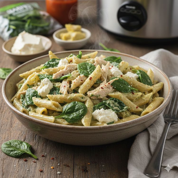 5-Ingredient Slow Cooker Spinach Artichoke Chicken Penne