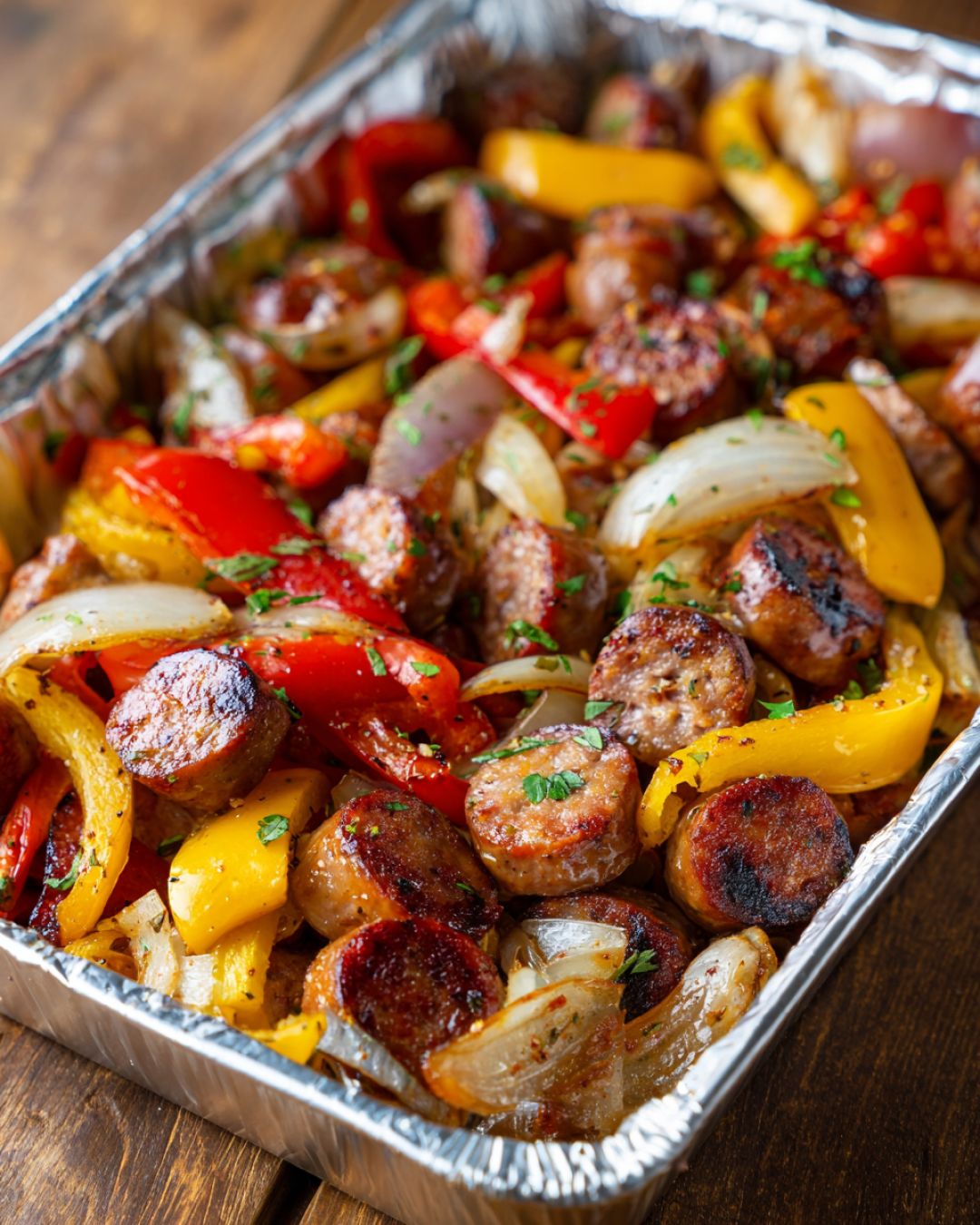 7. Rest and serve: Let the sausages rest on the tray for 5 minutes. Slice the sausages into thick pieces if you like, then toss them back with the peppers and onions so everything mingles. Taste a pepper and adjust seasoning with a bit more salt and pepper if needed, then serve hot.