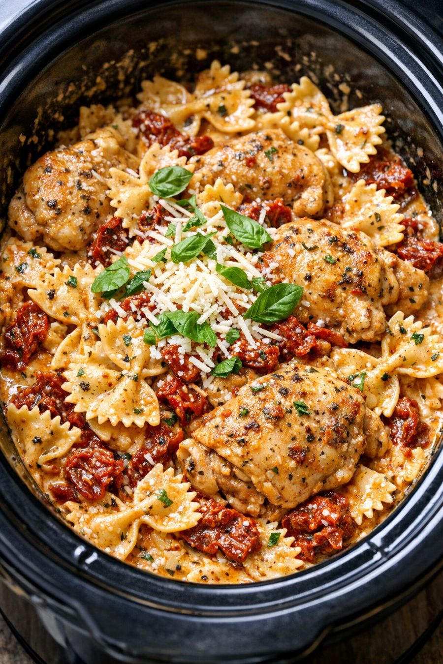 Slow Cooker Creamy Sun-Dried Tomato Chicken Bowtie