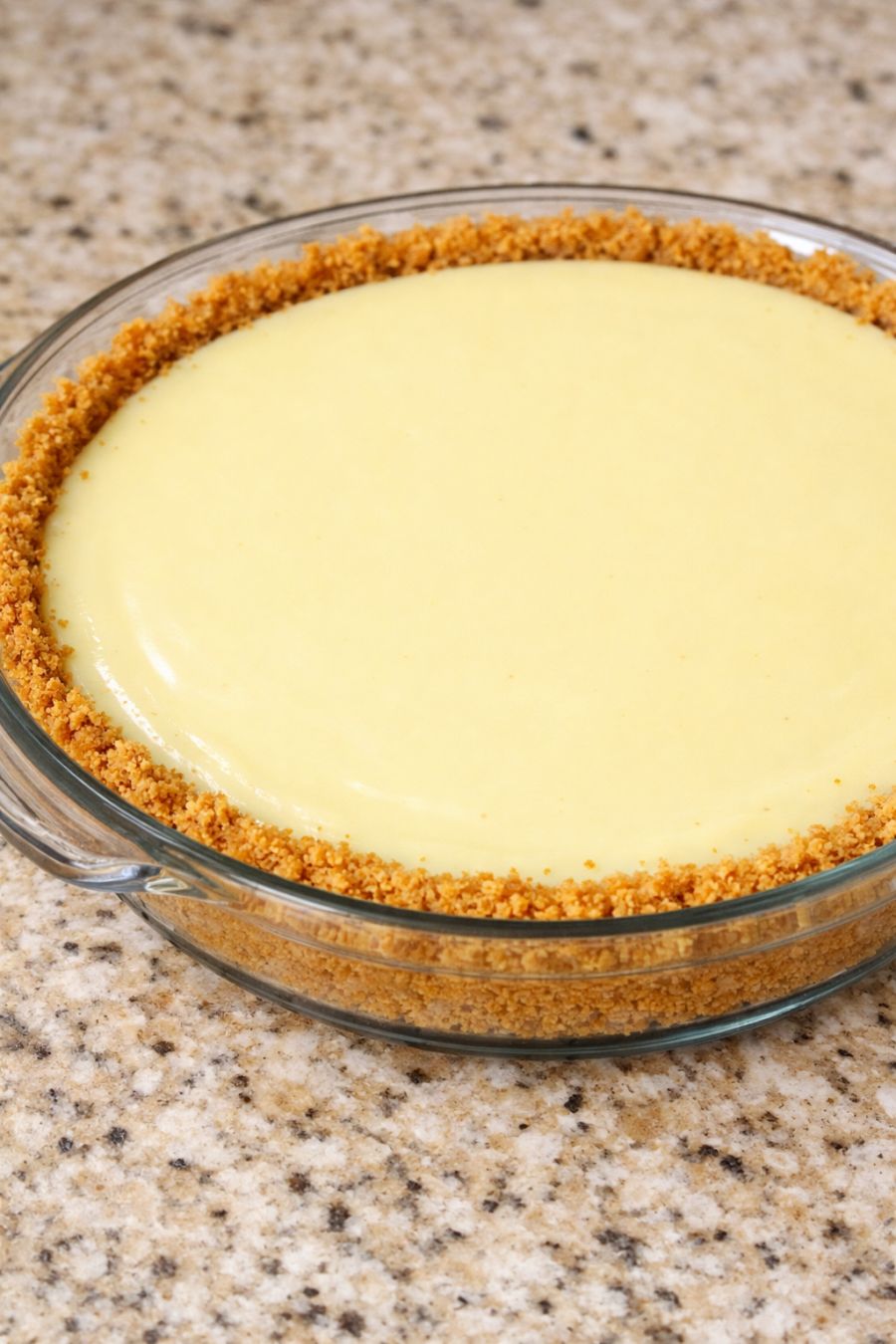 Fill the crust: Pour the lemon filling into the prepared graham cracker crust. Use a spatula to smooth the top so it’s level and glossy. If a few fine crumbs from the crust scatter onto the edge, just gently brush them toward the sides; a slightly rustic look is part of the charm.