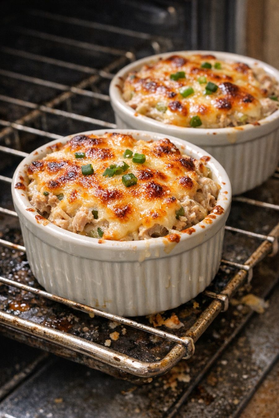 Place the bowls on a baking sheet for easier handling. Bake in the preheated oven for 10–12 minutes, or until the tuna mixture is heated through and the cheese on top is melted and bubbly.