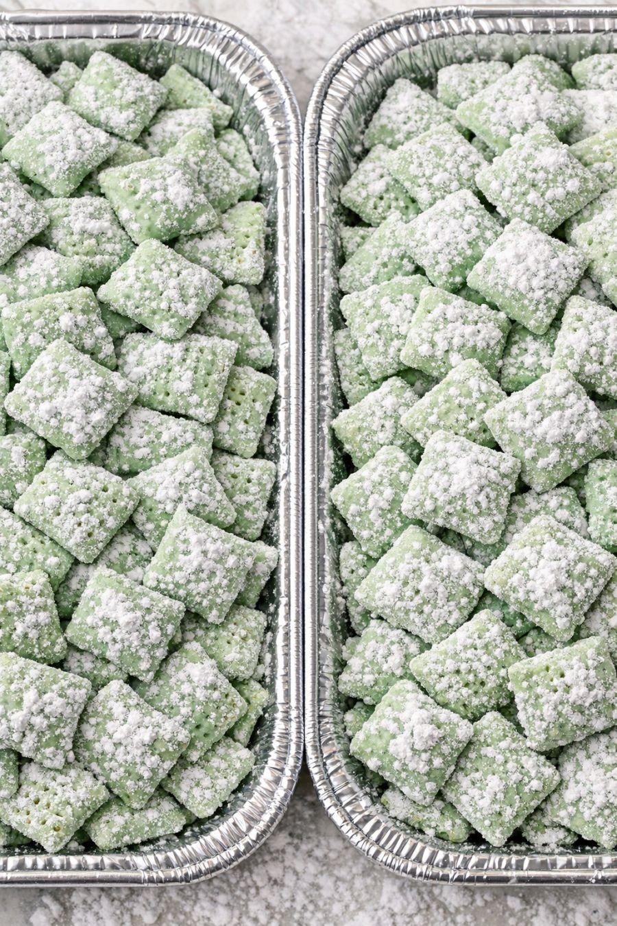 Transfer the mint chocolate muddy buddies into the prepared foil trays, spreading them out into an even layer so they can cool and crisp up. The mix should look like pastel green pieces peeking through a generous dusting of white powdered sugar.
