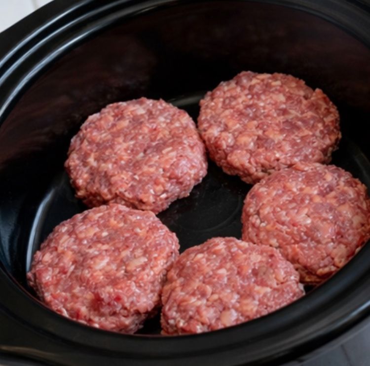 Lay the raw hamburger patties in a single layer on the bottom of the slow cooker. It’s fine if the edges touch slightly, but avoid stacking them.