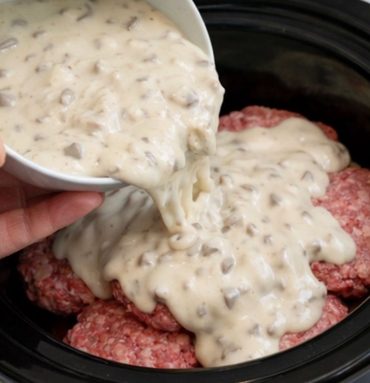 Pour the cream of mushroom soup mixture evenly over the raw hamburger patties in the slow cooker, making sure each patty is covered so they braise gently in the sauce as they cook.