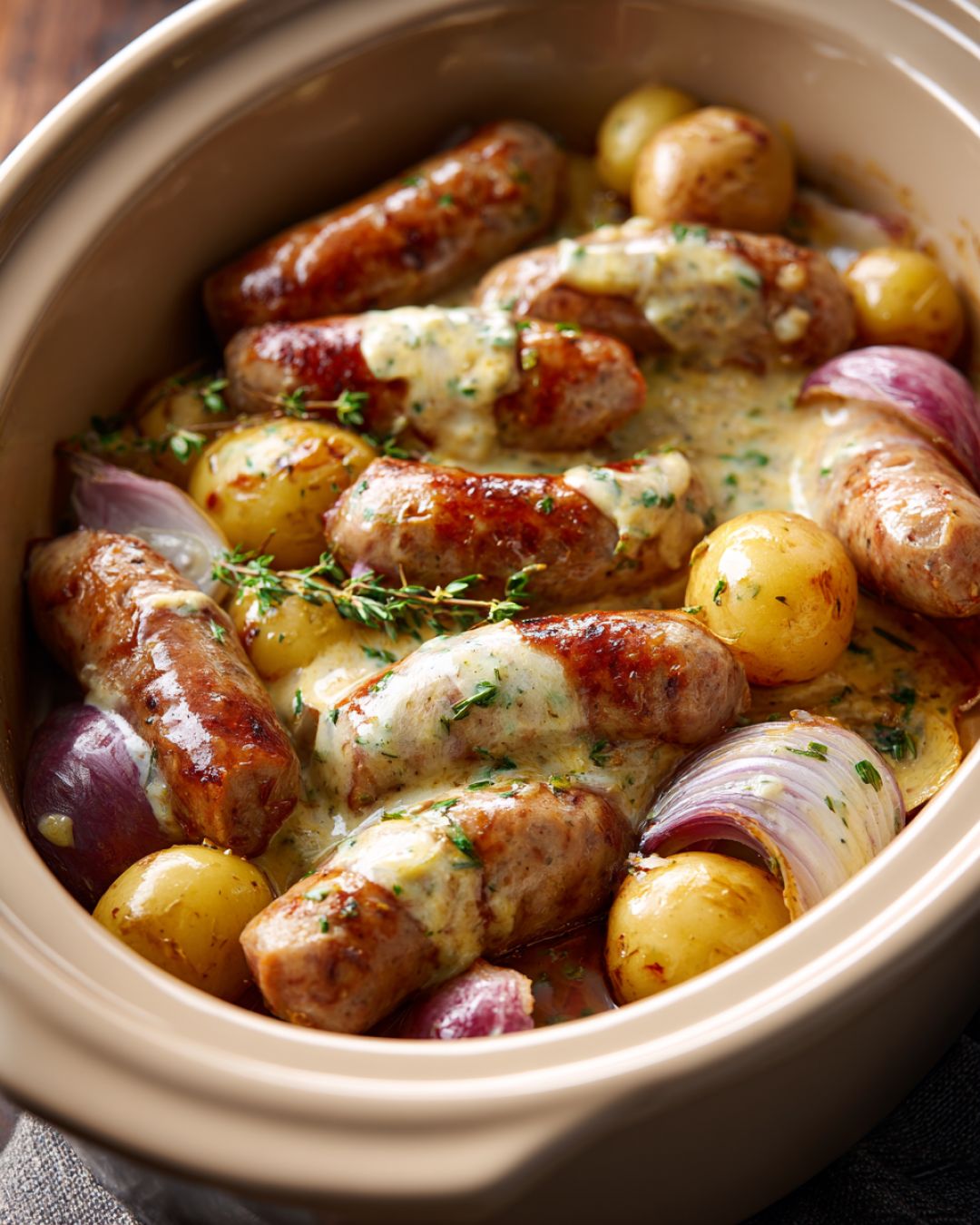 Cover and cook on LOW for 6–8 hours, or on HIGH for 3–4 hours, until the potatoes are tender and the sausage is fully cooked through (internal temperature should reach 160°F for pork sausage).