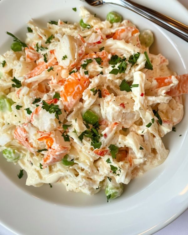 This creamy seafood salad pairs beautifully with a side of buttery corn on the cob or a fresh green salad tossed with a light vinaigrette. For a heartier meal, serve it alongside warm, crusty bread or a baked potato. A chilled glass of iced tea or lemonade complements the flavors wonderfully, making it an ideal choice for a summer lunch or a light dinner.