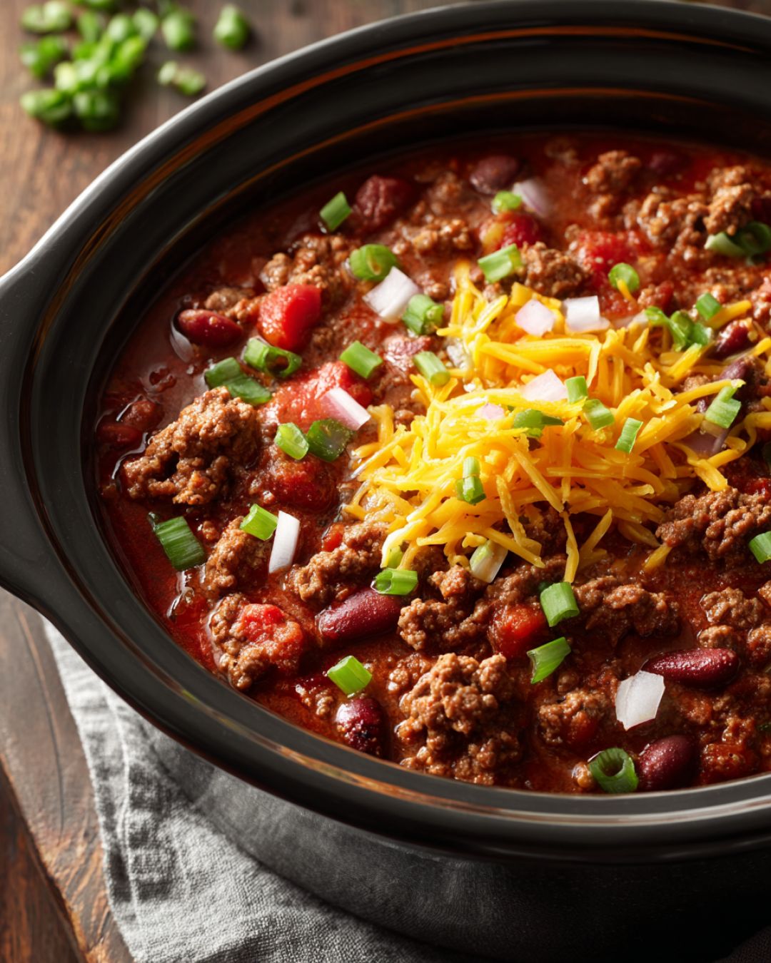 If you like a little more heat, add a can of diced tomatoes with green chilies in place of one can of regular tomatoes, or stir in a pinch of cayenne or crushed red pepper along with the seasoning mix. For a slightly sweeter, very Midwestern-style chili, add a tablespoon or two of ketchup or a small spoonful of brown sugar before cooking; many church potlucks around here have a version like that. You can swap one can of chili beans for kidney beans or black beans if that’s what you have in the pantry. If you prefer to drain off some fat, brown and crumble the ground beef with the onion in a skillet first, then drain and transfer to the slow cooker before adding the remaining ingredients. To make it stretch for a larger crowd, stir in an extra can of beans or a handful of dry macaroni during the last 30–40 minutes of cooking (add a bit of water if it gets too thick). Leftovers keep well in the fridge for several days and freeze nicely, so consider making a double batch for future easy suppers.