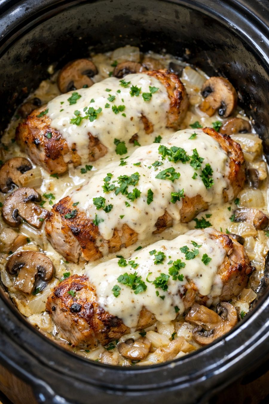 For extra richness, stir 2–3 tablespoons of grated Parmesan cheese into the sauce during the last 15 minutes of cooking. If you like a bit of heat, add 1/4 teaspoon red pepper flakes to the Alfredo mixture before pouring it over the pork. To make it feel a little lighter, use a lighter Alfredo sauce and swap some of the chicken broth for milk; the sauce will still be creamy but not as heavy. You can also add vegetables directly to the slow cooker: toss in 8 ounces of sliced mushrooms or a cup of baby carrots around the pork before pouring the sauce. If your sauce seems too thin at the end, remove the pork and whisk in a slurry of 1 tablespoon cornstarch mixed with 1 tablespoon cold water, then cook on HIGH for 10–15 minutes until thickened before adding the pork back. Leftovers keep well in the fridge for up to 3 days and are great tucked into toasted rolls for a creamy garlic pork sandwich.