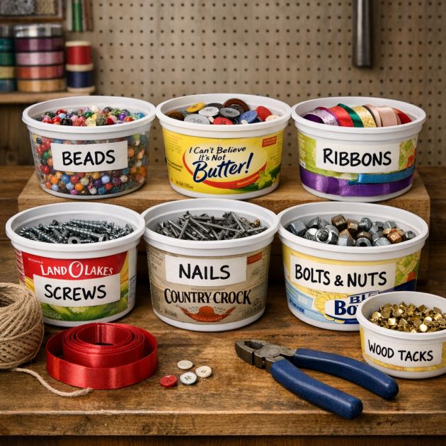 Butter tubs can be a lifesaver when it comes to organizing small items around the house. Use them to store craft supplies like beads, buttons, and ribbons. You can also sort hardware items such as screws, nails, and bolts, keeping them easily accessible.