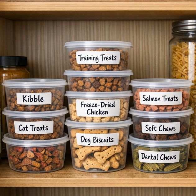 Label each tub with the type of food or treat inside, and keep them stacked in a cupboard or pantry. This method keeps your pet supplies organized and ensures that you always have fresh food and treats on hand.